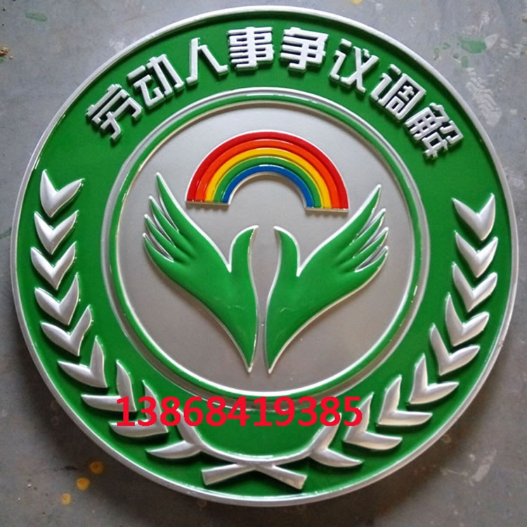 | 安裝方式 | 黑龍江勞動人事爭議調解徽-小徽章背面都配有穿掛耳孔,釘子釘在墻上,再用穿鐵絲鋼絲,適合安裝在辦公室/會議室會場等。大徽后面為膨脹螺絲孔,安裝需要定做鐵架,鐵架固定墻面上后,再將徽章固定在鐵架上。玻璃幕墻也是需要鐵架方式安裝。 |